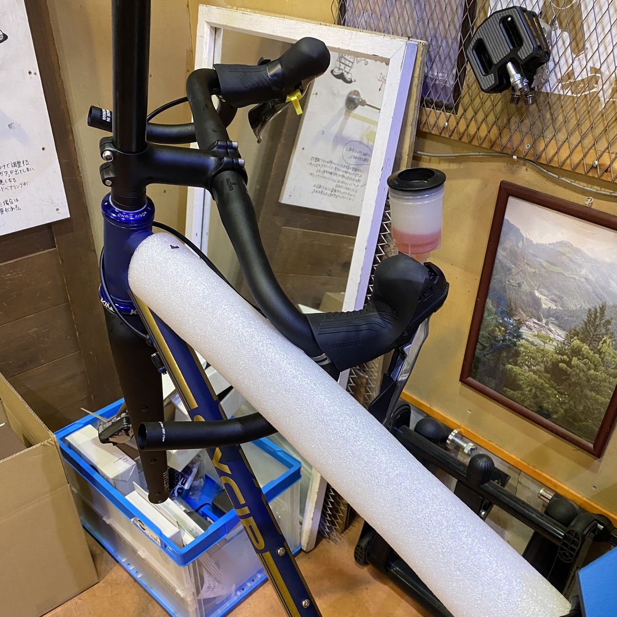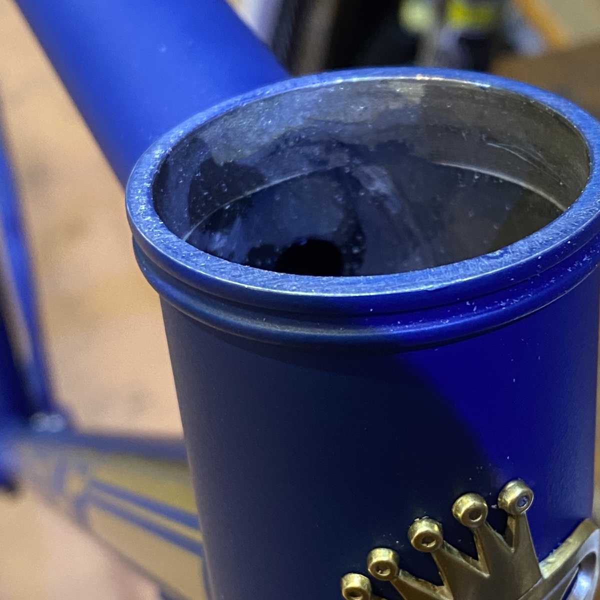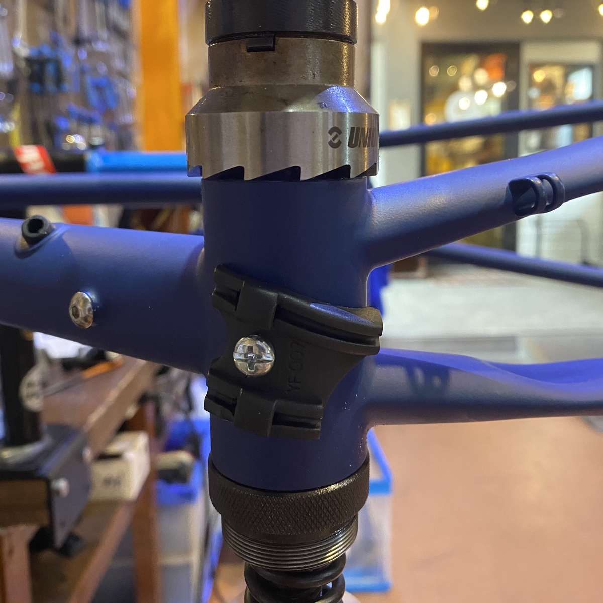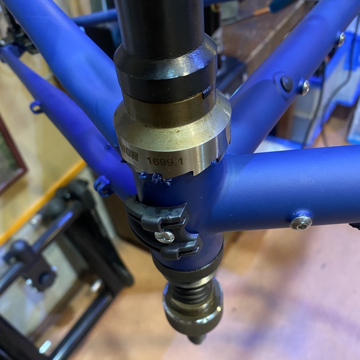 オーダーフレームなので,フォークコラム長はある程度めどが立っていたのに後回しにした結果は少し面倒でした。ワイヤ類が固定済なので,ソーガイドを固定したバイスまで自転車ごと持っていく必要があり,オリーブ取り出しで私を救ってくれたノブくんにサポートいただきました。本当に感謝。