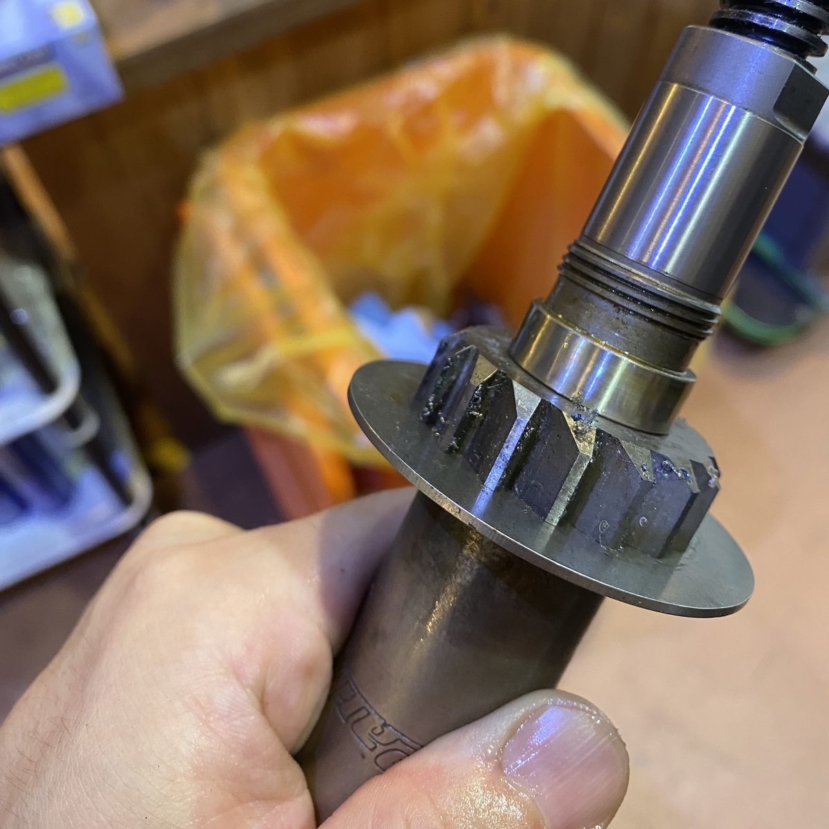 反対側のレバーのホース接続ボルトを開けた時に,何気なく奥を覗いたら傾いたオリーブが入っていることに気が付き,その場で倒れそうになりました。慌てて最初に締めたレバーのボルトを外すと,中に異様な形につぶれたオリーブが入っているのが見えました。「はい死んだ!今俺の限定版レバー死んだよ!」の叫びを必死に抑えてピッキングツールでつぶれたオリーブを半泣きで取り出しました。が,進みつつある老眼でピントが合わずうまく取り出せません。もう写真を撮る余裕なんかない。1時間半つぶれたオリーブと格闘しても取り出せず,気持ちが折れて膝から崩れ落ちそうになったところで,カルチャークラブスタッフのノブくんがラジオペンチ片手に立ち上がり,数分の作業の結果つぶれたオリーブを取り出してくれました。神。