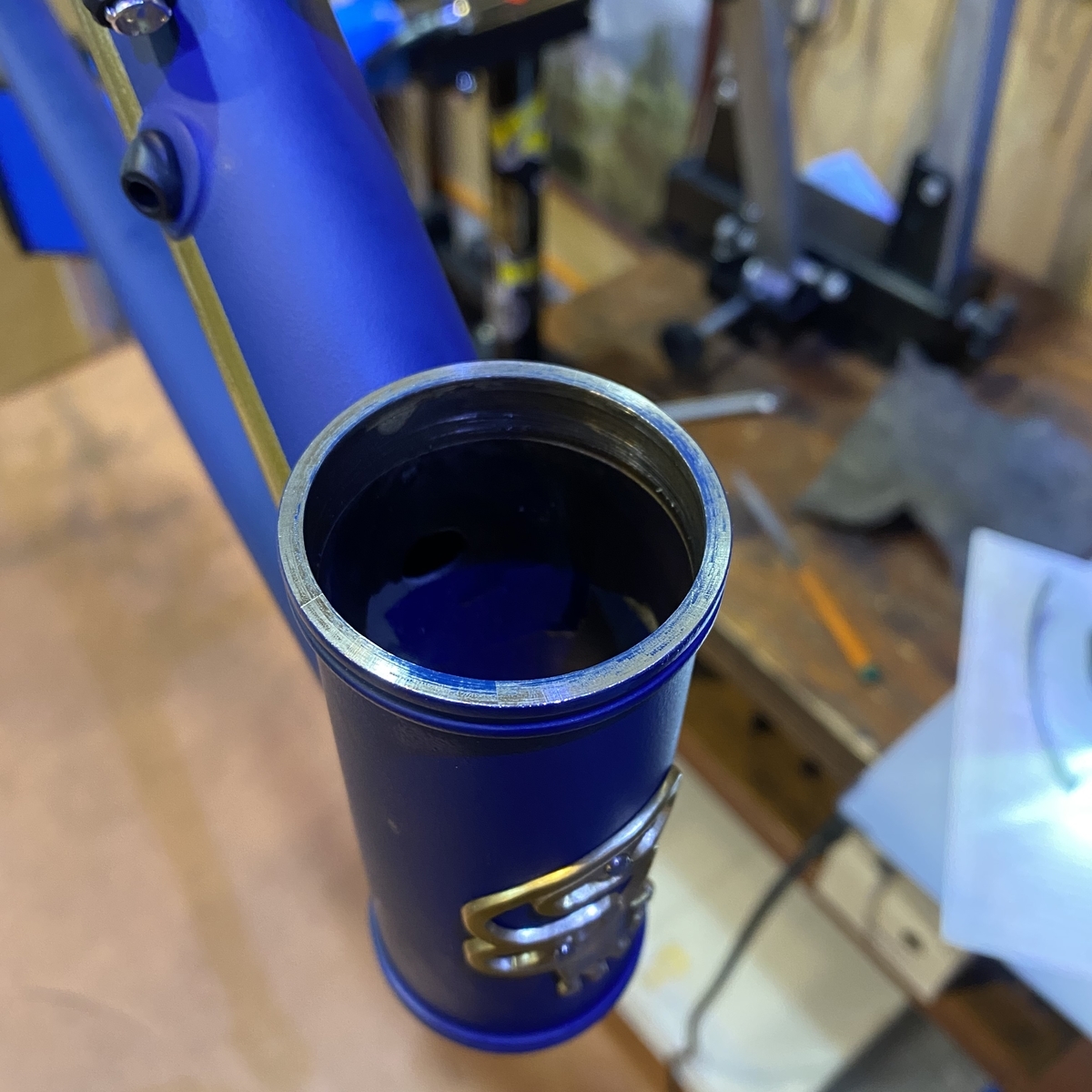うっすら下地の金属が見えるくらい。C面取り0.1mmくらいの感覚です。これをヘッドチューブ上下とも実施します。失敗を考慮して目立たない下側から作業しました。