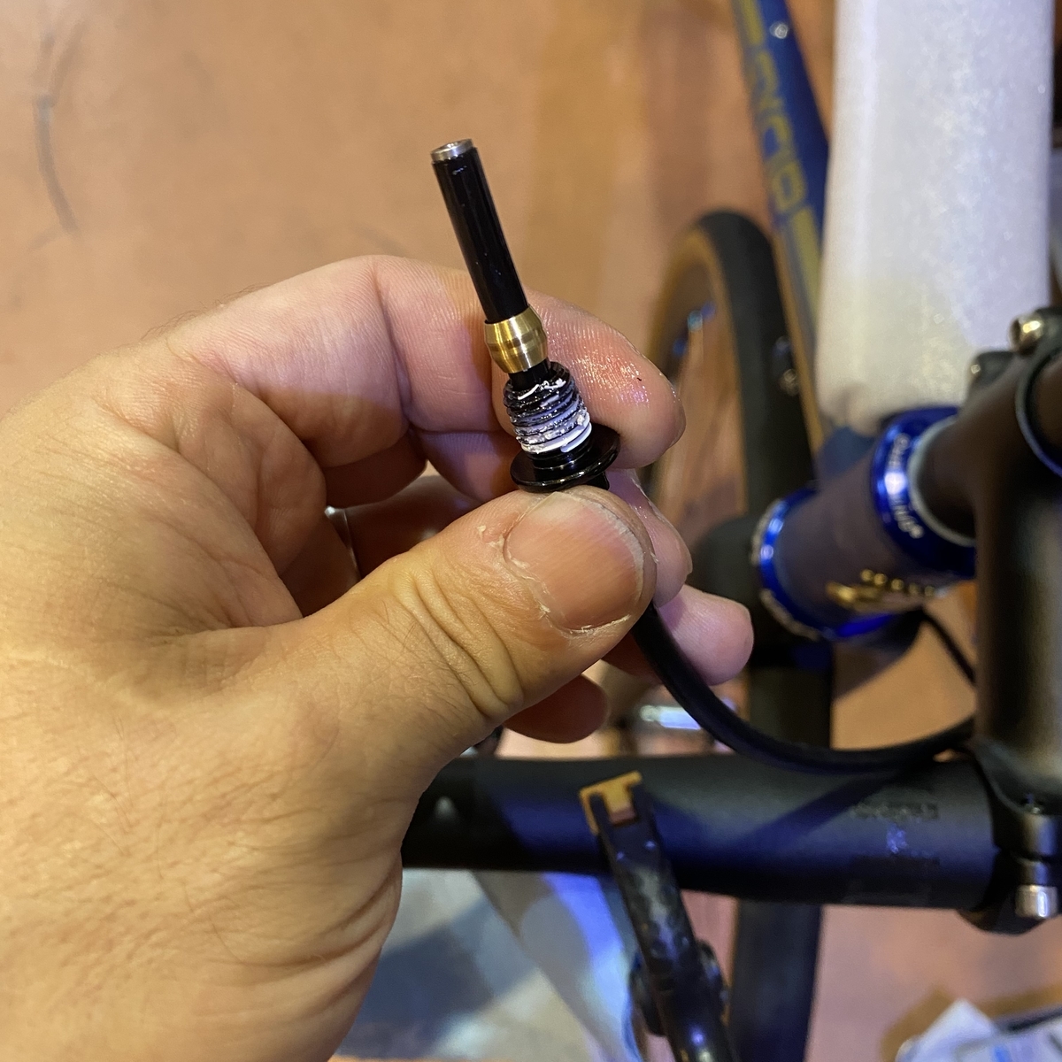 ブレーキホースが通ったら,STIレバーへ接続です。あらかじめハンドルバーを組み付けておき,レバーのポジションをざっくり決めます。レバーに対してホースの長さを決めたらカットします。