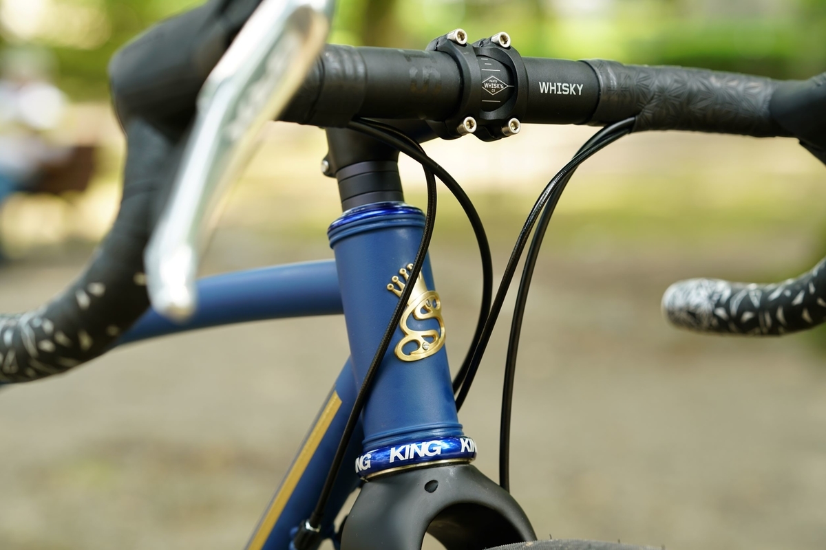 上下とも圧入できました。下ワンのロゴは5箇所あり,今回私はKINGとKINGの間が中心に来るように組み付けました。マットネイビーのフレームに艶ありネイビーのヘッドパーツが映えます。